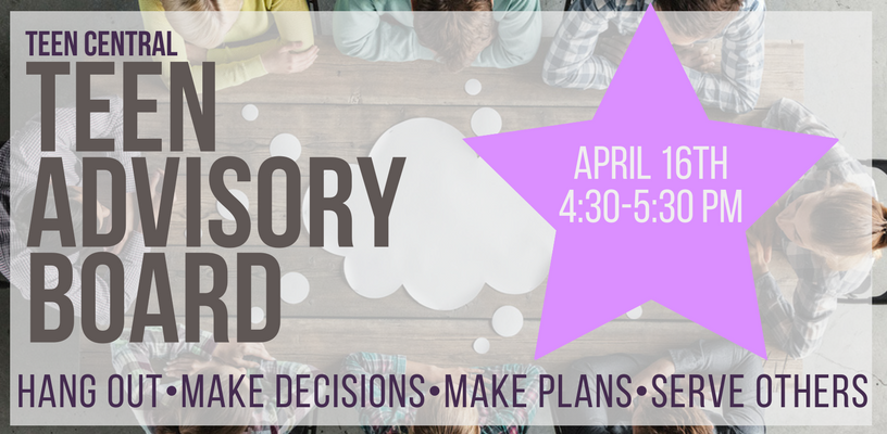 The Teen Advisory Board is a group of teens who meet once a month with the Teen Services Librarian. They advise the Teen Services Librarian on Library programs and materials for teenagers. This is a chance for teens to tell the Librarian what they want from their Library.
