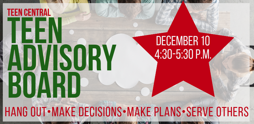 The Teen Advisory Board is a group of teens who meet once a month with the Teen Services Librarian. They advise the Teen Services Librarian on Library programs and materials for teenagers. This is a chance for teens to tell the Librarian what they want from their Library.